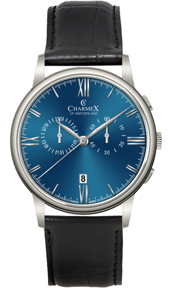 M’s chronograph BELLAGIO, Ronda cal. 5021D Swiss Made quartz mvt, 10 jewels, blue dial, nickel hands/numerals, stainless steel case, sapphire crystal, 5atm, black leather strap (length 200mm, width 20mm, with double pusher butterfly buckle). Case: diameter 42.0 mm, thickness 9.5mm, weight 90gr. HS Code: 9102.1100.125 -