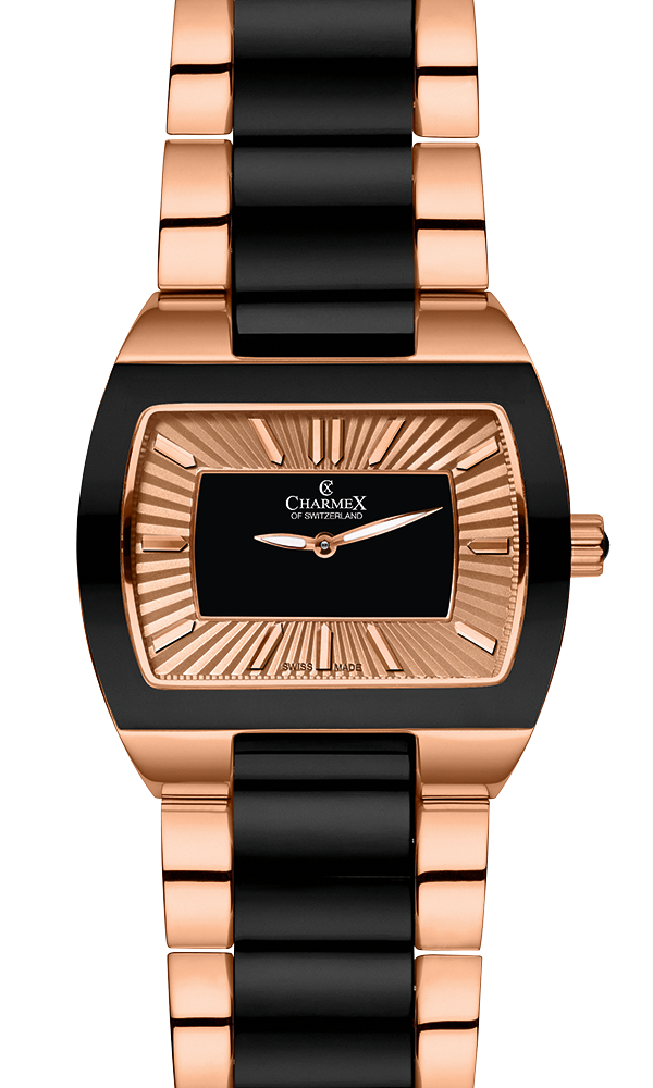 L’s Watch CORFU, Ronda cal. 762 quartz mvt., 4 jewels, rose dial, rose gold PVD plated stainless steel case with black ceramic/stainless steel back, sapphire crystal, 3 ATM, rose gold PVD plated stainless steel bracelet (with black ceramic with double pusher butterfly buckle). Case: 38,5 x 29,0 mm. Weight: 142gr. HS Code: 9102.1100.116 -
